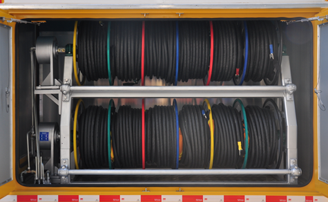 收放便捷、噪聲低:車廂前部的凹頂凸邊造型,搭配駕駛室導流罩流線,凹頂平台可安裝頂置空調與(yu) 升降照明燈,凹頂結構還巧妙地將前端風窗後移,配合凸邊隔擋風窗噪聲外泄;鋁型材高檔流水簷,與(yu) 車廂外觀動感搭配。帶色標的自動收放電纜卷盤,防止收放電纜操作失誤。液壓馬達驅動電纜卷盤,更方便,更快捷。