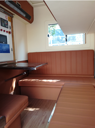 操作舒適:房車品質的控製室折疊式座鋪、方桌,適用於(yu) 多人同時辦公的同時,也可躺臥,作為(wei) 臨(lin) 時休息區。控製室內(nei) 角落空間設置櫃架;空調、配電插口等輔助設施,快捷舒適。