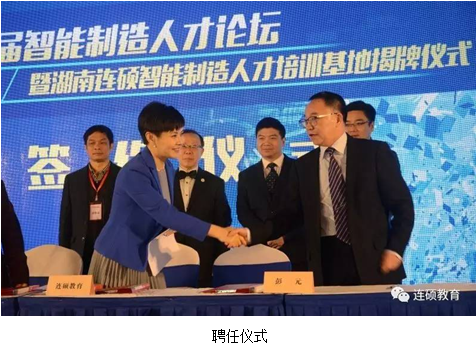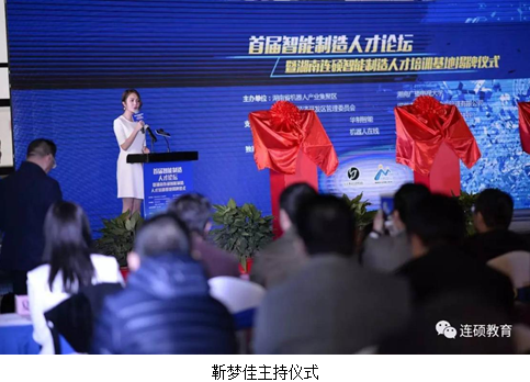 楊婭董事長與(yu) 部分政府、院校領導共同揭牌:湖南連碩智能製造人才基地、湖南廣播電視大學與(yu) 湖南網絡工程學院機器人實訓基地、湖南科技職業(ye) 學院機器人實訓基地、湖南智能製造人才服務中心。