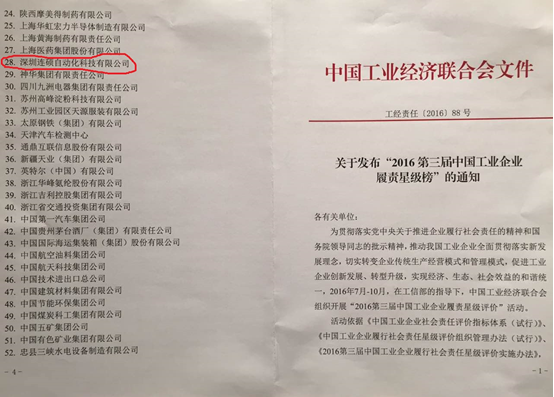 連碩科技又傳(chuan) 佳績!在剛剛結束的由中國工業(ye) 經濟聯合會(hui) 主辦的2017中國企業(ye) 可持續發展大會(hui) 上,我公司全資子公司深圳連碩自動化科技有限公司上榜“2016第三屆中國工業(ye) 企業(ye) 履責星級榜”,被授予“中國工業(ye) 行業(ye) 履行社會(hui) 責任五星級企業(ye) (2016)”稱號。連碩科技是唯一一家獲此殊榮的深圳企業(ye) ,同時上榜的還有國家電網公司、中國第一汽車集團、中國航天科技集團公司、中國航空油料集團公司等多家世界500強企業(ye) 。