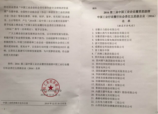 “2016第三屆中國工業(ye) 企業(ye) 履責星級評價(jia) ”活動於(yu) 2016年7月-10月,由中國工業(ye) 經濟聯合會(hui) 在工信部的指導下組織開展。活動依據《中國工業(ye) 企業(ye) 社會(hui) 責任評價(jia) 指標體(ti) 係(試行)》、《中國工業(ye) 企業(ye) 履行社會(hui) 責任星級評價(jia) 組織管理辦法(試行)》、《2016第三屆中國工業(ye) 企業(ye) 履行社會(hui) 責任星級評價(jia) 實施辦法》,經過企業(ye) 登錄“中國工業(ye) 企業(ye) 社會(hui) 責任報告提交及績效評價(jia) 係統”自願申報、全國性行業(ye) 聯合會(hui) (協會(hui) )和省區市工業(ye) 經濟聯合會(hui) (協會(hui) )等單位推薦、審核、初評、複審、有關(guan) 部門征求意見、公示等程序,產(chan) 生“2016第三屆中國工業(ye) 企業(ye) 履責星級榜”,授予52家上榜企業(ye) “中國工業(ye) 行業(ye) 履行社會(hui) 責任五星級企業(ye) (2016)”稱號。