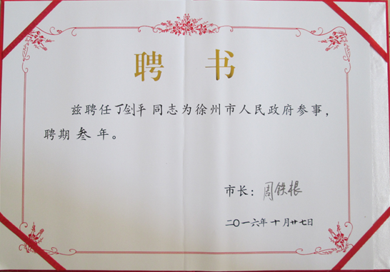 2016年10月31日,徐州市人民政府舉(ju) 行會(hui) 議,聘任丁劍平先生等15人為(wei) 市政府參事。參事隊伍是一支重要的參政谘詢力量,有利於(yu) 促進政府決(jue) 策的科學化、民主化,將發揮參政議政、建言獻策、谘詢國是、民主監督、統戰聯誼等作用。